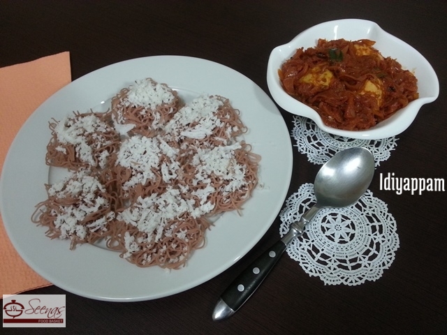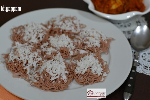 We make Idiyappam with chemba puttu podi (Red Rice Flour) or with vella puttu podi (White Rice Flour) pressed in to noodle form and then steamed.
